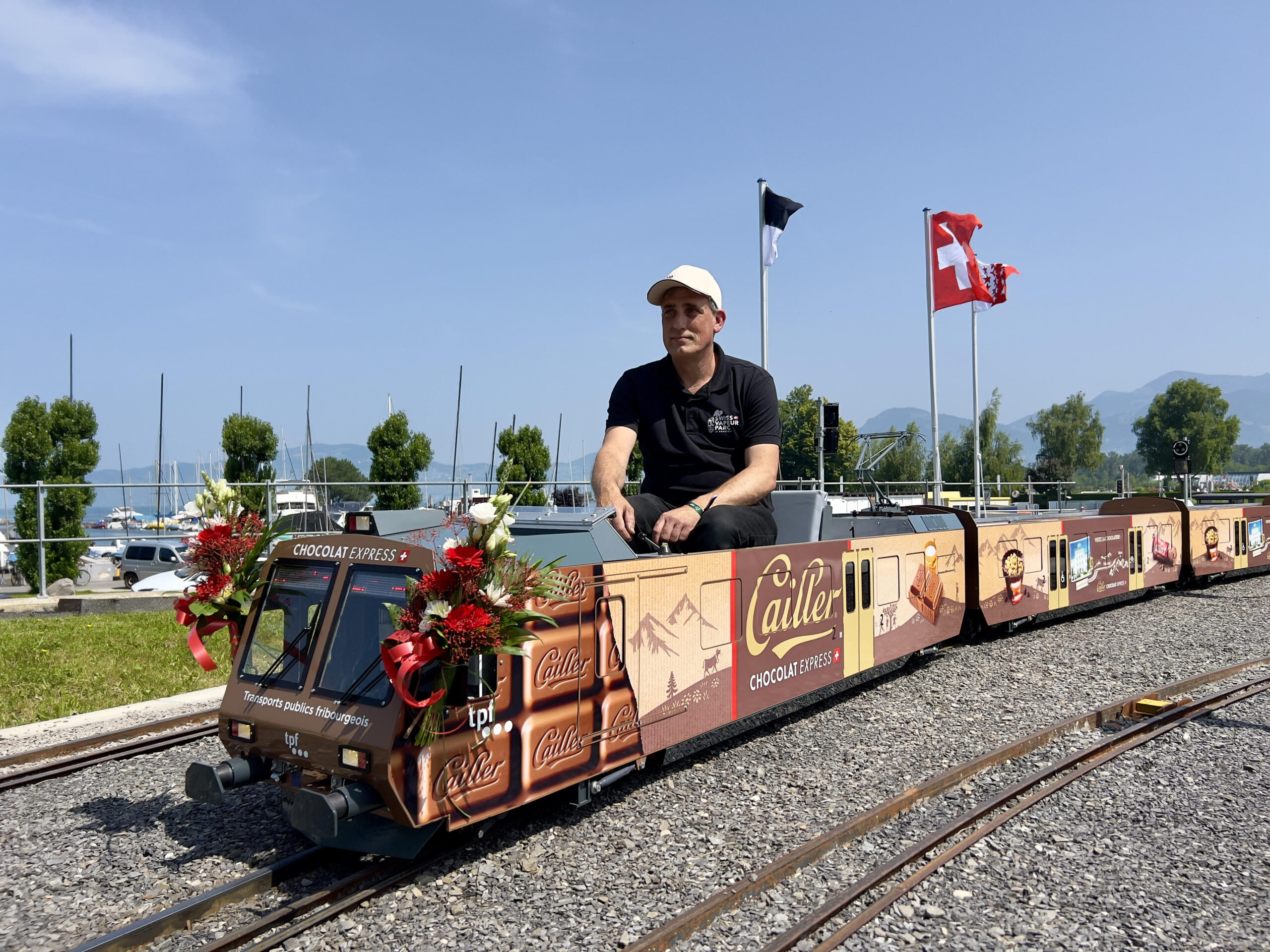 C’est la nouvelle attraction du Swiss Vapeur Parc. Le Chocolat Express, modèle réduit d’un train des Transports Publics Fribourgeois qui voyage entre Berne et la Maison Cailler de Broc, circule désormais sur les 3 km de voies du réseau du site touristique du Bouveret. Pour les TPF, une manière de fêter, en grand, ses 25 ans.