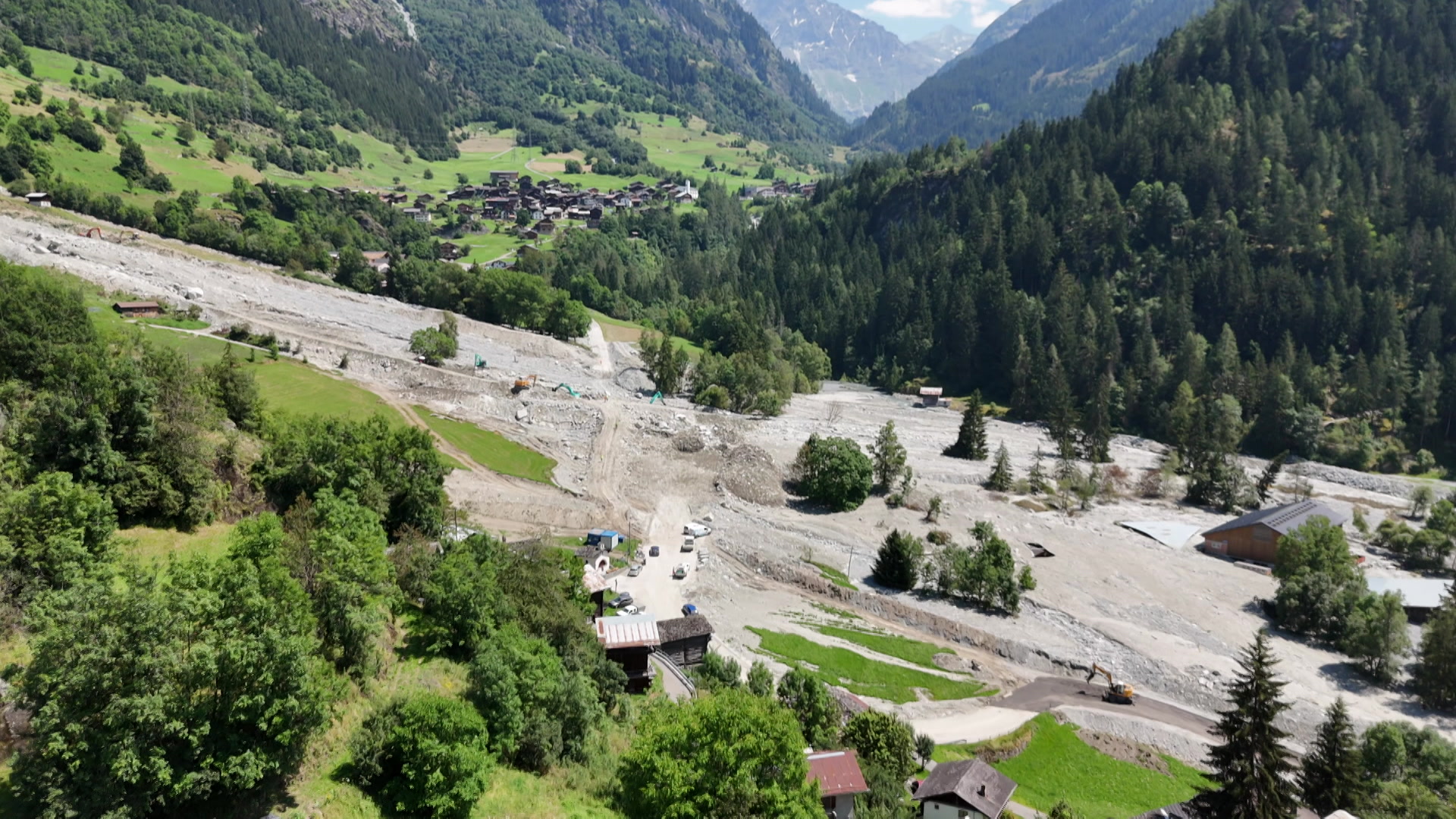 À Lourtier, les pelles mécaniques s’activent pour rendre le Haut Val de Bagnes accessible au trafic routier. La route cantonale devrait rouvrir fin août au plus tard. Notre reportage.