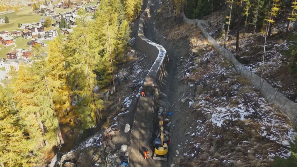 Der rund 300m lange Schutzwall oberhalb von Randa ist in einer Woche fertig. Im Moment laufen noch die letzten Arbeiten. Der Schutz gegen Steinschlag soll eine rote Zone wieder zurückbringen.